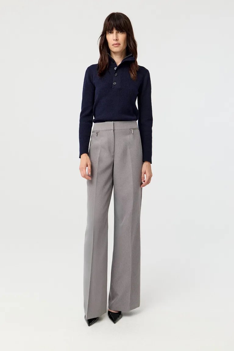 Pantalón de sastrería con diseño de tiro alto y pierna ancha. Presenta una silueta estructurada con bolsillos frontales con cierre y acceso central. Una prenda versátil y clásica para completar conjuntos formales o de oficina con un estilo contemporáneo y elegante.