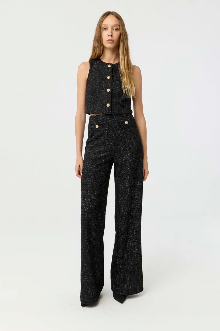 Pantalón de tiro alto con diseño de pierna ancha, incorporando bolsillos delanteros con detalle de botones dorados. Esta prenda se destaca por su estilo elegante y versátil, ofreciendo un calce cómodo que se adapta a la silueta. Ideal para combinar en diversos outfits, proporcionando un aspecto sofisticado y moderno para el uso diario o eventos formales.