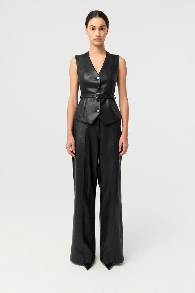 Pantalón de tiro alto con diseño de pierna ancha, ideal para un estilo sofisticado y moderno. Presenta una silueta fluida con cierre central, bolsillos diagonales y detalles de alforzas en el frente, brindando una estructura elegante y versátil para diversos eventos. Su corte favorecedor permite un calce cómodo y preciso, convirtiéndose en una prenda esencial para elevar cualquier conjunto tanto de día como de noche.