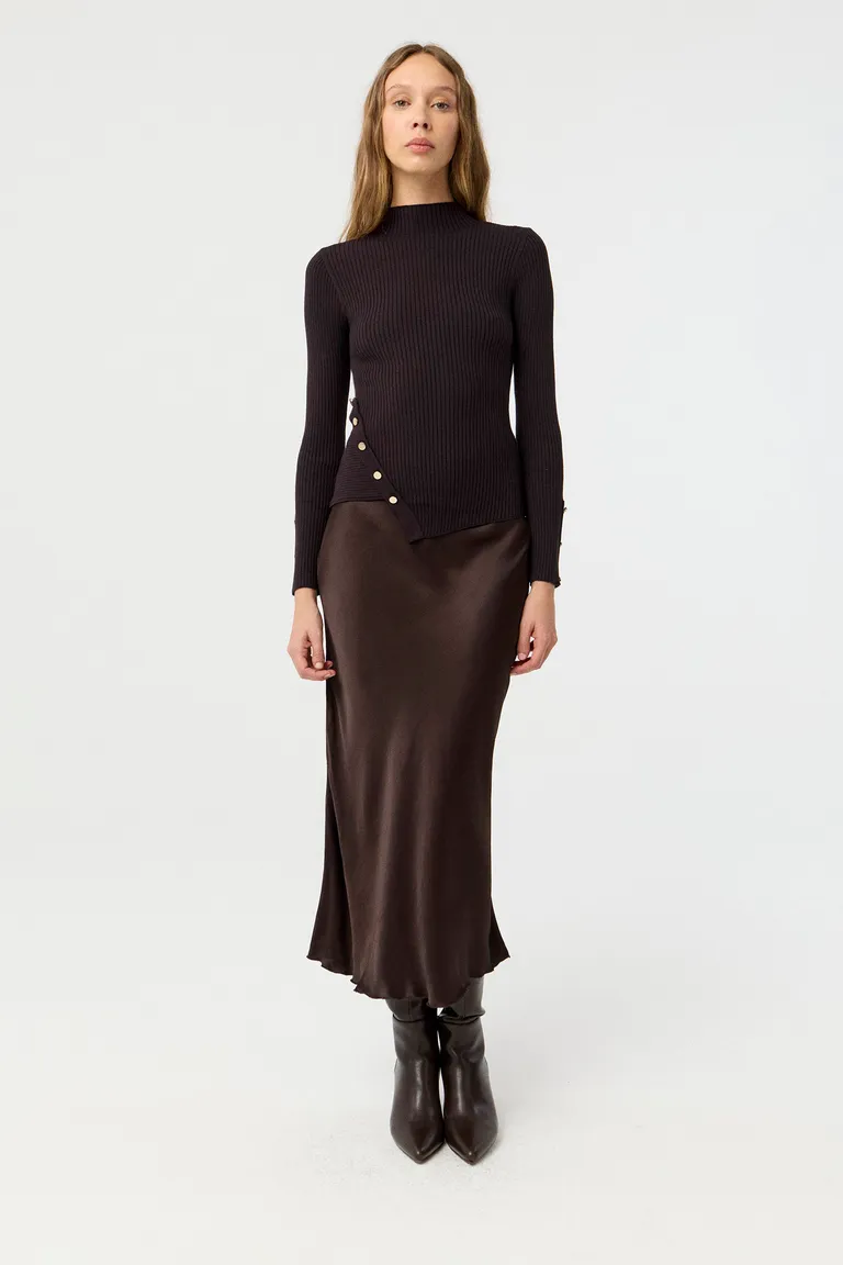 Polera de manga larga con tejido de punto acanalado y diseño de cuello semipolera. Presenta un corte asimétrico con detalles de botones decorativos en el lateral y los puños, aportando un toque distintivo. Una prenda versátil ideal para completar conjuntos de invierno con elegancia y confort.