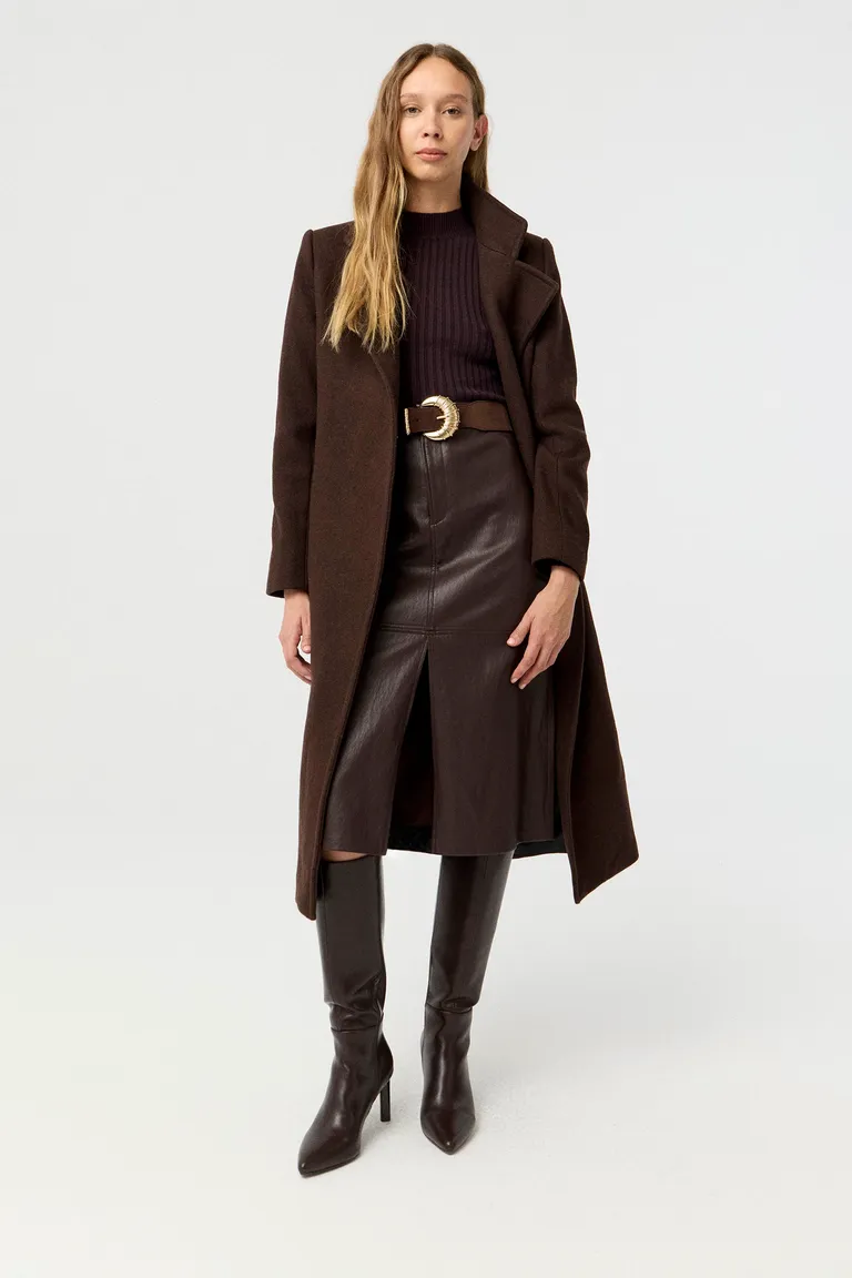 Pollera midi de tiro alto con diseño evasé y tajo frontal. Presenta detalle de recortes con pespuntes que estructuran la prenda, ofreciendo una opción versátil para diversos outfits. Ideal para quienes buscan una pieza con presencia y estilo para usar en cualquier ocasión.