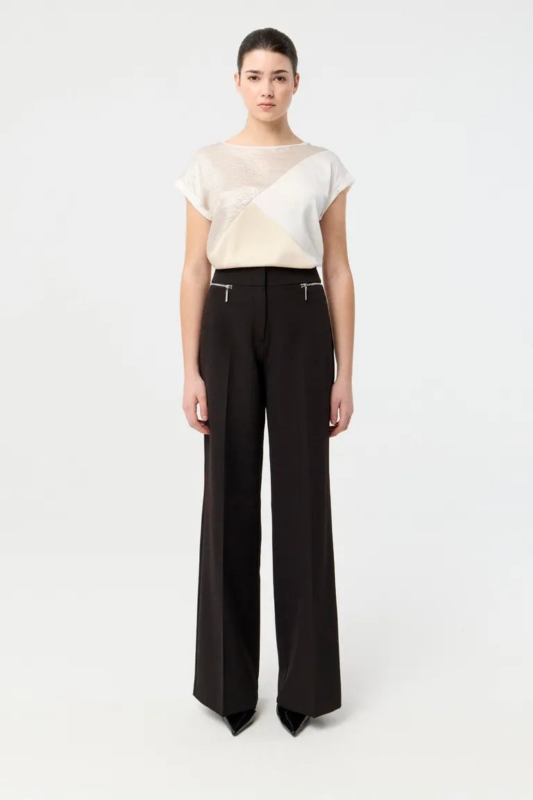 Remera de corte relajado con escote bote y mangas con ruedo. Su diseño presenta un panel frontal en texturas contrastantes con un estilo minimalista y sofisticado. Ideal para combinar en diversos outfits, ofrece un calce cómodo y versátil para el uso diario o eventos formales. Prenda esencial que destaca por su elegancia y sencillez, adaptándose perfectamente a diferentes siluetas femeninas.