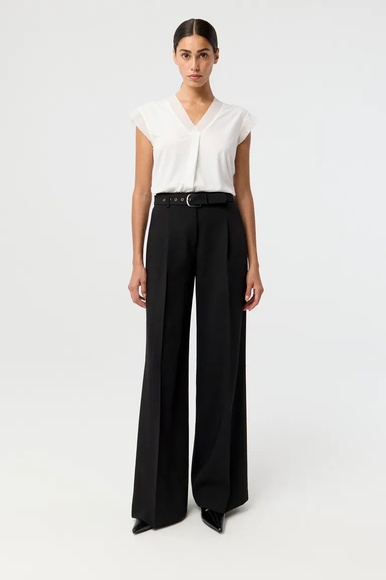 Remera de calce relajado y hombros caídos con escote en V y detalle de tabla central. Un diseño versátil con terminaciones en gasa que aporta sofisticación a cualquier conjunto diario. Ideal para quienes buscan una prenda básica con un toque de textura distintivo.