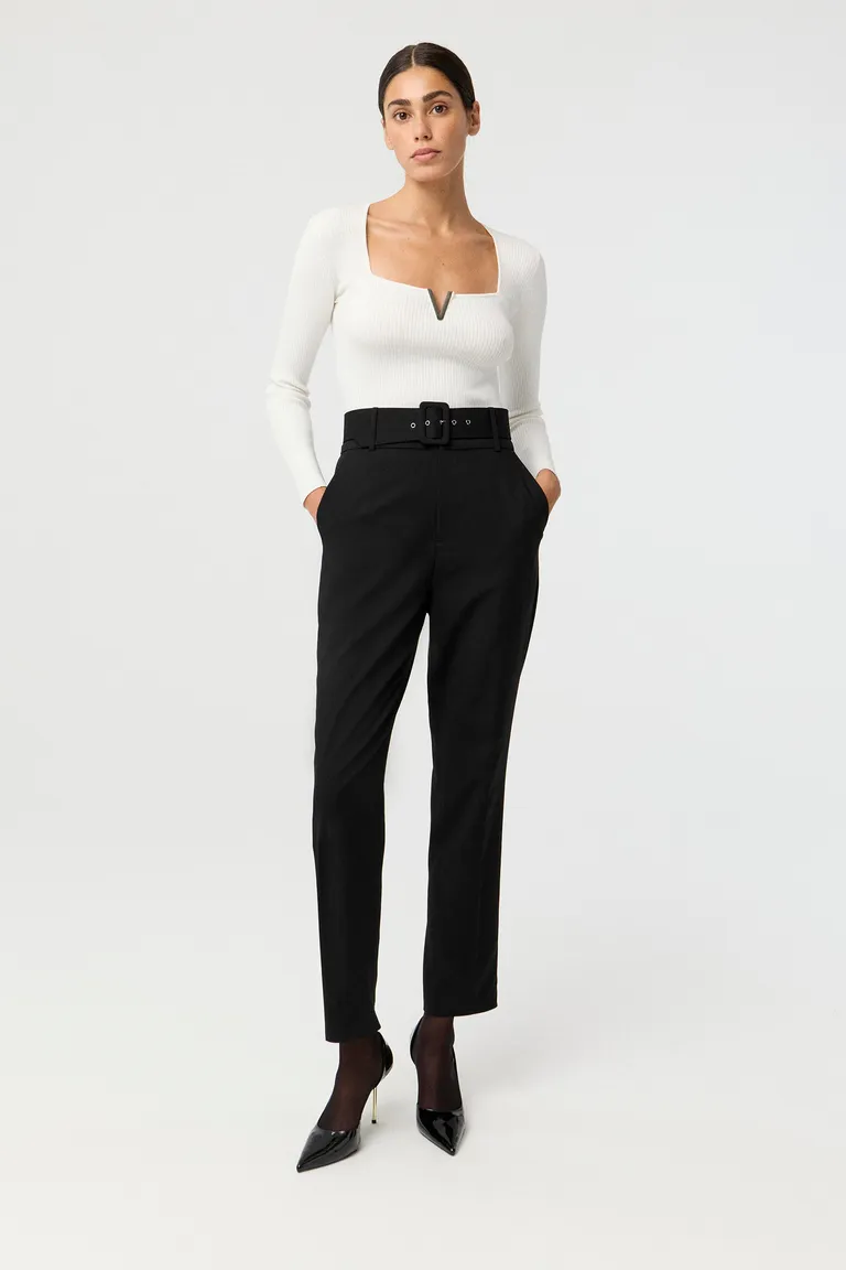 Remera de manga larga tejida en punto acanalado con diseño de calce anatómico. Presenta un escote cuadrado distintivo con detalle de chapón metálico en el centro. Esta prenda básica y versátil es ideal para complementar equipos de sastrería o jeans en looks cotidianos o formales. Su diseño aporta un toque moderno a cualquier conjunto de temporada.