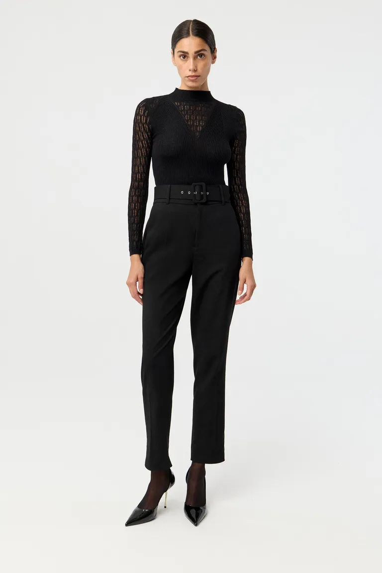 Remera de mangas largas con diseño de cuello semipolera y escote en V. Presenta un patrón calado en las mangas y un calce anatómico, ideal para incorporar en conjuntos de uso diario o eventos formales. Es una prenda versátil para combinar con diferentes estilos.