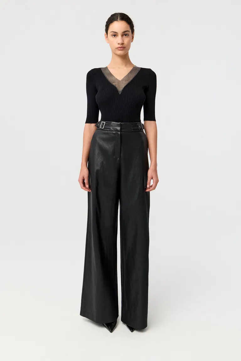 Remera de punto acanalado con mangas tres cuartos y diseño anatómico. Presenta un escote en V realzado por detalles de strass que añaden un toque distinguido y moderno a la prenda. Ideal para elevar outfits cotidianos o completar looks nocturnos con un estilo sofisticado y versátil para toda ocasión.