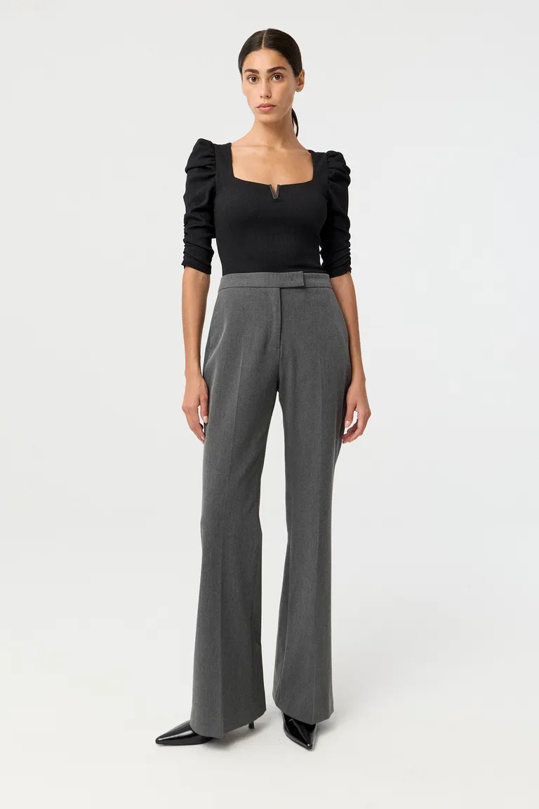 Remera de calce anatómico con mangas tres cuartos, escote cuadrado y detalle de chapón metálico. Presenta mangas con efecto abullonado y frunces en el antebrazo. Una prenda versátil y moderna que se adapta a diversas ocasiones, tanto para un look de trabajo como para salidas nocturnas.