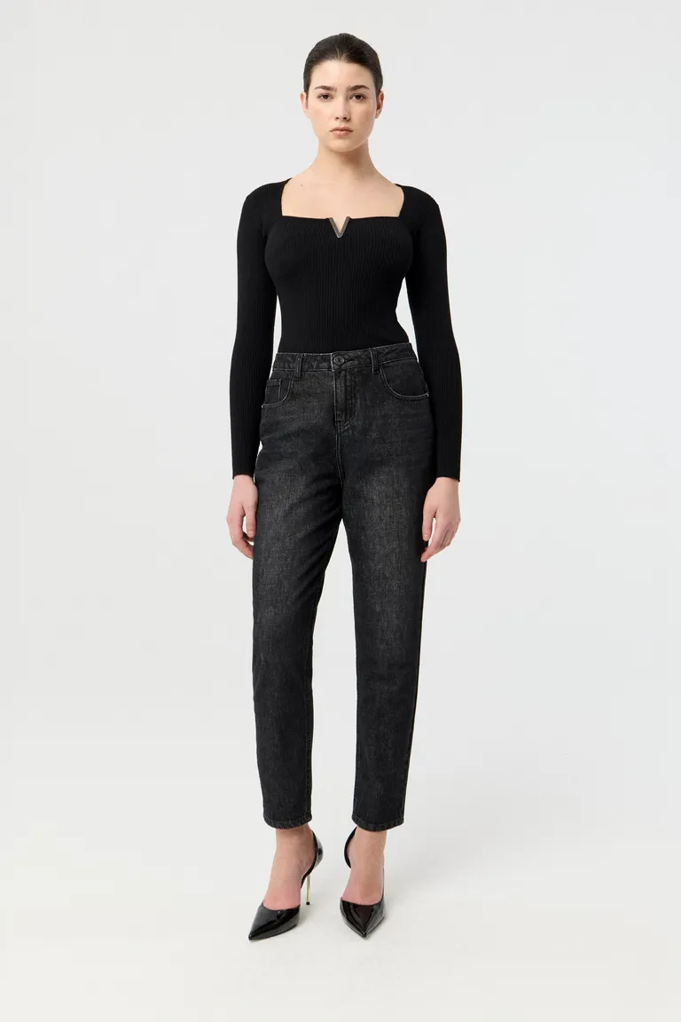 Remera de punto acanalado con mangas largas, diseño de calce anatómico y escote cuadrado con detalle metálico. Una prenda básica ideal para completar looks cotidianos con un toque elegante y versátil.