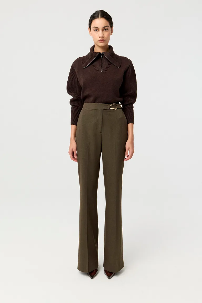 Sweater de tejido con calce relajado y mangas largas, diseñado con cuello alto y cierre metálico frontal. Presenta un estilo con reminiscencias de los años 90 y detalles de cambio de punto en cuello y mangas. Una prenda versátil y cómoda, perfecta para combinar en outfits diarios.