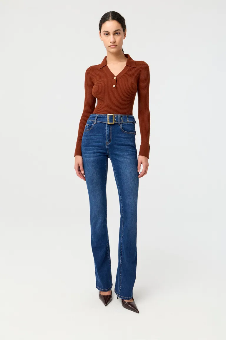 Sweater tejido con textura acanalada de calce anatómico. Presenta diseño de mangas largas con puños, cuello estilo polo con escote en V y detalle de botones metálicos en la cartera. Una prenda versátil ideal para completar conjuntos casuales o elegantes durante toda la temporada.