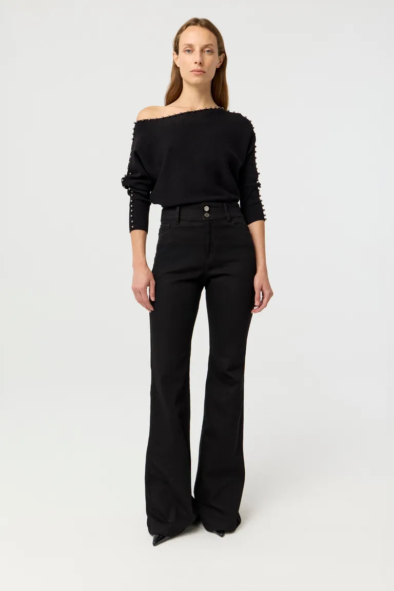 Sweater tejido de calce relajado con mangas 3/4. Presenta escote bote y detalle de perlas metálicas aplicadas tanto en el borde del escote como a lo largo de las mangas. Su largo llega hasta la primera cadera, siendo una prenda versátil para combinar con pantalones de tiro alto en diversas ocasiones.