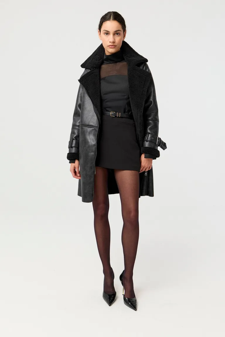 Tapado largo con diseño biker de estilo moderno. Presenta solapas amplias, cierre frontal y un ajuste entallado que destaca la figura. Una prenda versátil ideal para completar outfits en días de bajas temperaturas, combinando funcionalidad y tendencia para diversas ocasiones de uso.