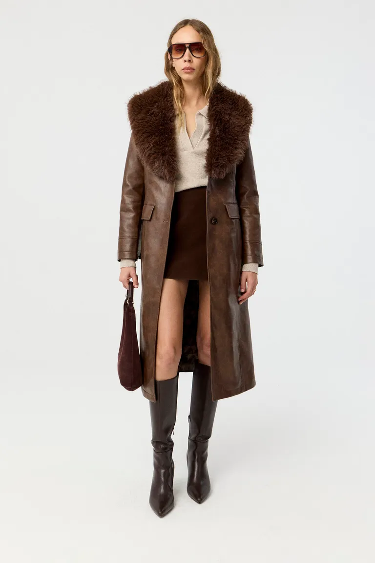 Tapado largo de diseño estructurado, con cuello de pelo sintético y cierre frontal con botones. Presenta un corte entallado que estiliza la silueta, ideal para los días de bajas temperaturas. Un abrigo versátil y sofisticado con detalles clásicos que complementa cualquier outfit formal o casual durante la temporada de invierno.