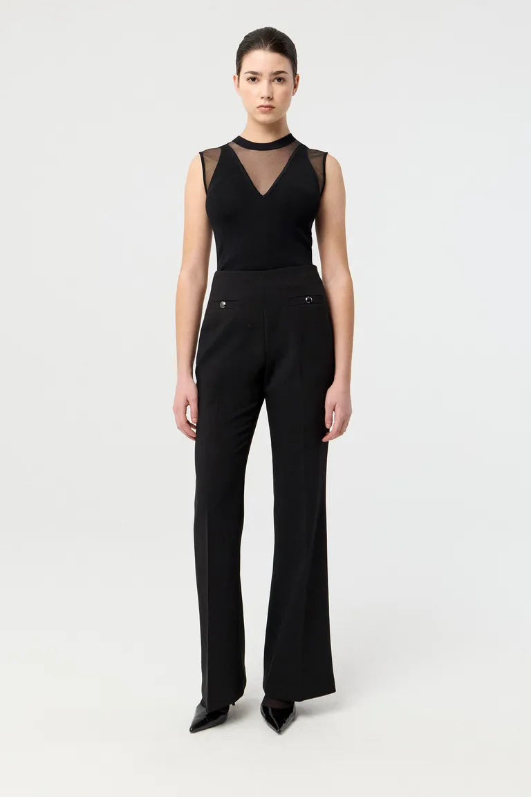 Top de calce anatómico con diseño de escote en v y detalles en transparencia sobre el área de los hombros y el cuello. Presenta un estilo ajustado al cuerpo con cuello redondo a la base y mangas cortas integradas. Una prenda básica y versátil, ideal para completar equipos formales o de noche con un toque elegante y moderno.