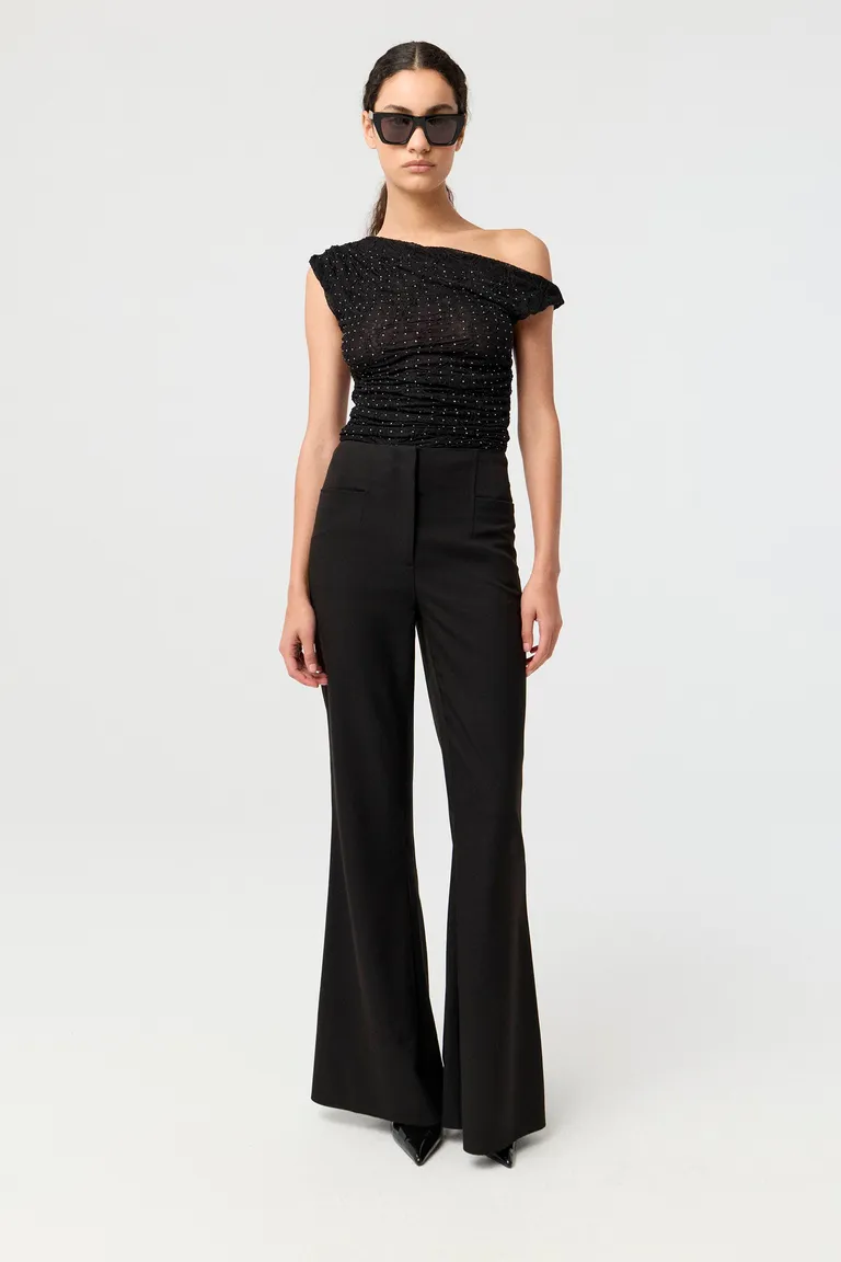 Top de ajuste entallado con diseño de escote asimétrico que deja un hombro al descubierto. Presenta detalles de cristales distribuidos en la superficie, ideal para lograr un estilo sofisticado en eventos nocturnos. Su diseño permite una silueta definida y moderna, combinable con diversas prendas inferiores para crear un conjunto versátil.