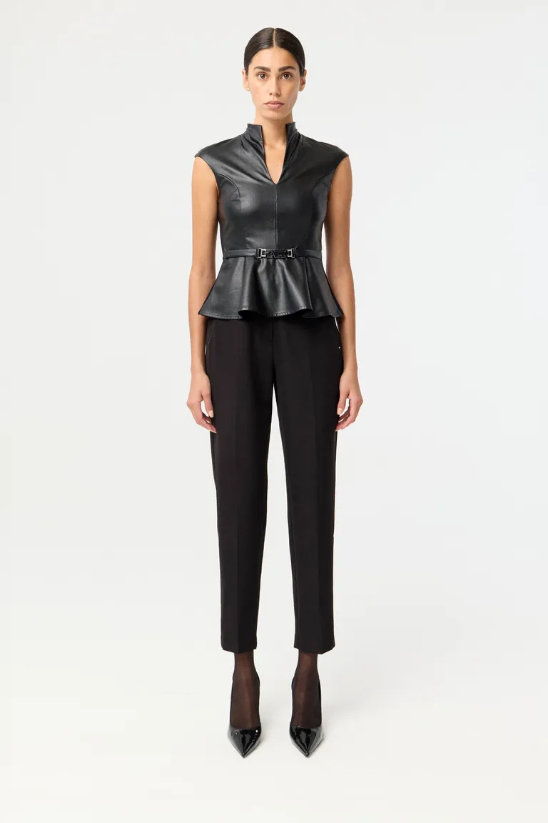 Top sin mangas con diseño estructurado, cuello alzado y detalle de péplum en la cintura. Incluye un cinturón integrado con detalle metálico para resaltar la silueta. Ideal para combinar con pantalones de vestir o faldas para lograr un look formal y sofisticado. Presenta un diseño entallado que se ajusta perfectamente al cuerpo, aportando un toque moderno a cualquier conjunto de día o de noche.
