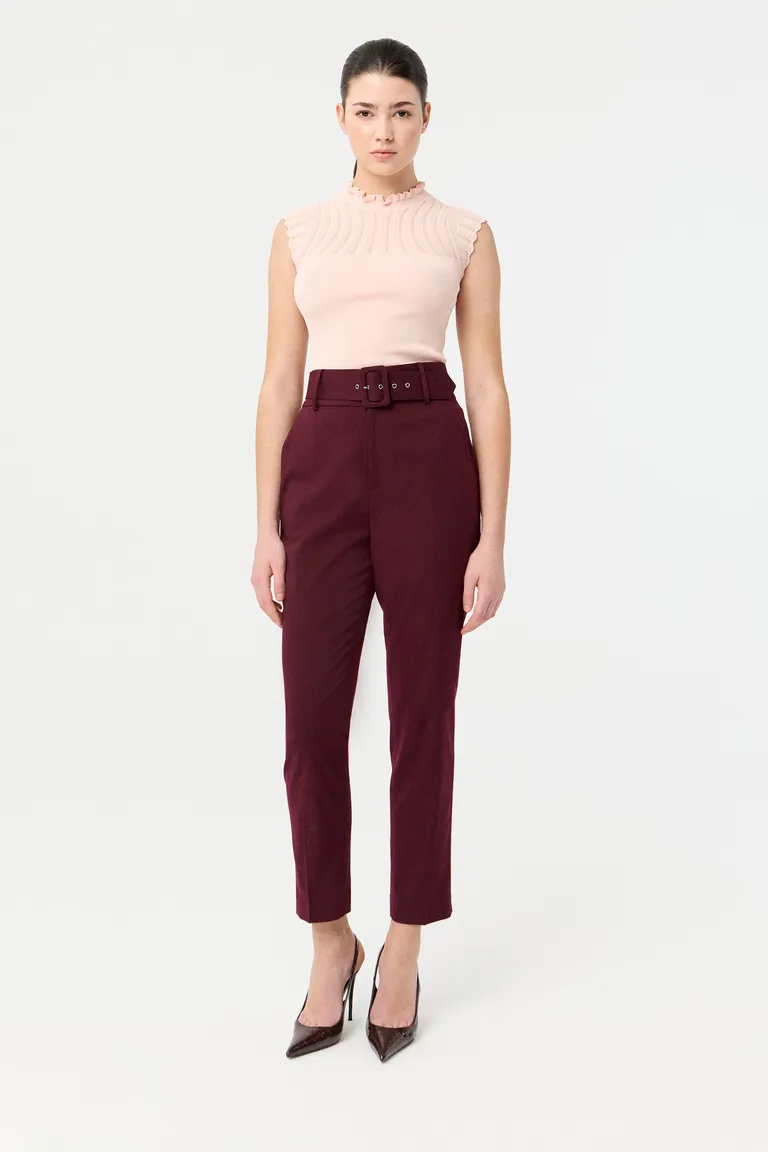 Top tejido de diseño femenino con cuello alto decorado con volados. Presenta un delicado detalle de tejido calado en el frente y un ajuste anatómico que realza la silueta. Es una prenda versátil ideal para combinar en outfits diarios o eventos que requieren un toque de distinción y elegancia en el guardarropa.
