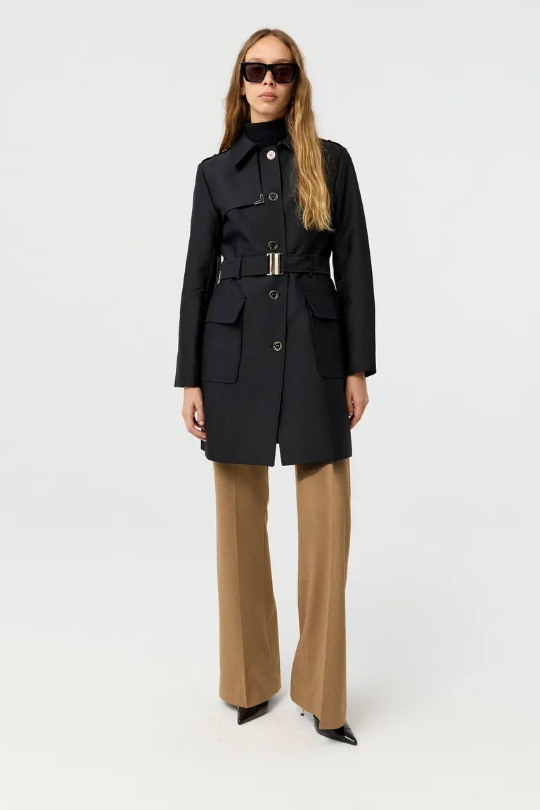 Trench de diseño clásico con cierre frontal de botones y ajuste en la cintura mediante cinturón con hebilla metálica. Presenta bolsillos plaqué frontales, cuello camisero y un corte que sigue la línea del cuerpo. Ideal como prenda de abrigo versátil para completar conjuntos urbanos y formales con una estética sofisticada.