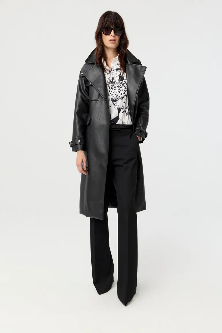 Trench de calce cruzado con solapas amplias y diseño estructurado. Este abrigo largo presenta detalles de hebillas metálicas en puños, cuello y cintura, junto con un cinturón integrado que define la silueta. Su corte moderno y acabado liso aportan versatilidad para diversas ocasiones, manteniendo una línea elegante y atemporal en el vestuario femenino. Una prenda funcional para completar conjuntos diarios con estilo propio.