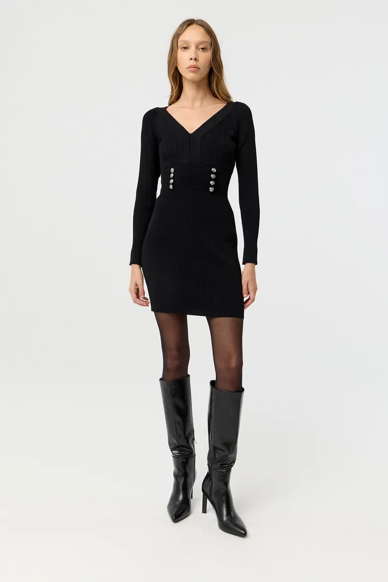 Vestido corto de punto con textura acanalada, corte al cuerpo y escote en v. Este diseño de mangas largas incorpora un detalle de botones decorativos en la cintura, ofreciendo una silueta entallada. Ideal para combinar en diversos outfits diarios o eventos sociales, proporcionando un estilo elegante y versátil para toda ocasión.