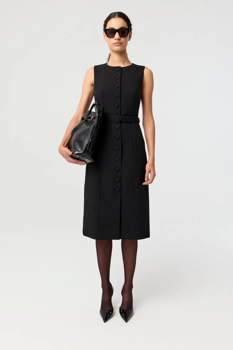 Vestido midi de sastrería con silueta recta, sin mangas y escote a la base. Presenta un cierre frontal con botones y un cinturón desmontable con hebilla forrada para ajustar la cintura. Un diseño clásico y sofisticado, ideal para completar looks formales o de oficina con un estilo sobrio y versátil.
