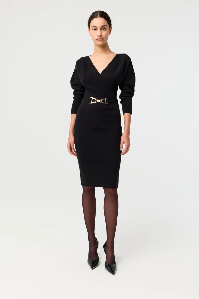 Vestido midi de tejido de punto con escote en V y delantero superpuesto. Este modelo presenta mangas largas y un cinturón incorporado con hebilla metálica en la cintura que marca la silueta. De diseño anatómico y estilo elegante, esta prenda es ideal para ocasiones formales y eventos nocturnos.