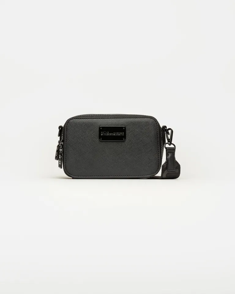 Elegante bolso de mano rígido y estructurado, fabricado en material saffiano con un acabado sofisticado. Cuenta con un llamativo chapón metálico en la tapa frontal y herrajes a tono que le otorgan un toque distintivo. Perfecto para complementar cualquier look urbano y chic.