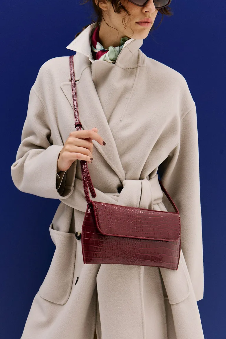 Cartera bandolera de tamaño compacto con diseño de textura efecto reptil y solapa frontal. Cuenta con una correa larga regulable y desmontable que permite llevarla al hombro o cruzada. Es un accesorio funcional y versátil, diseñado con un sistema de cierre práctico y un interior forrado que incluye un compartimento pequeño para organizar objetos personales. Ideal para complementar diferentes outfits diarios o de noche con un toque elegante.