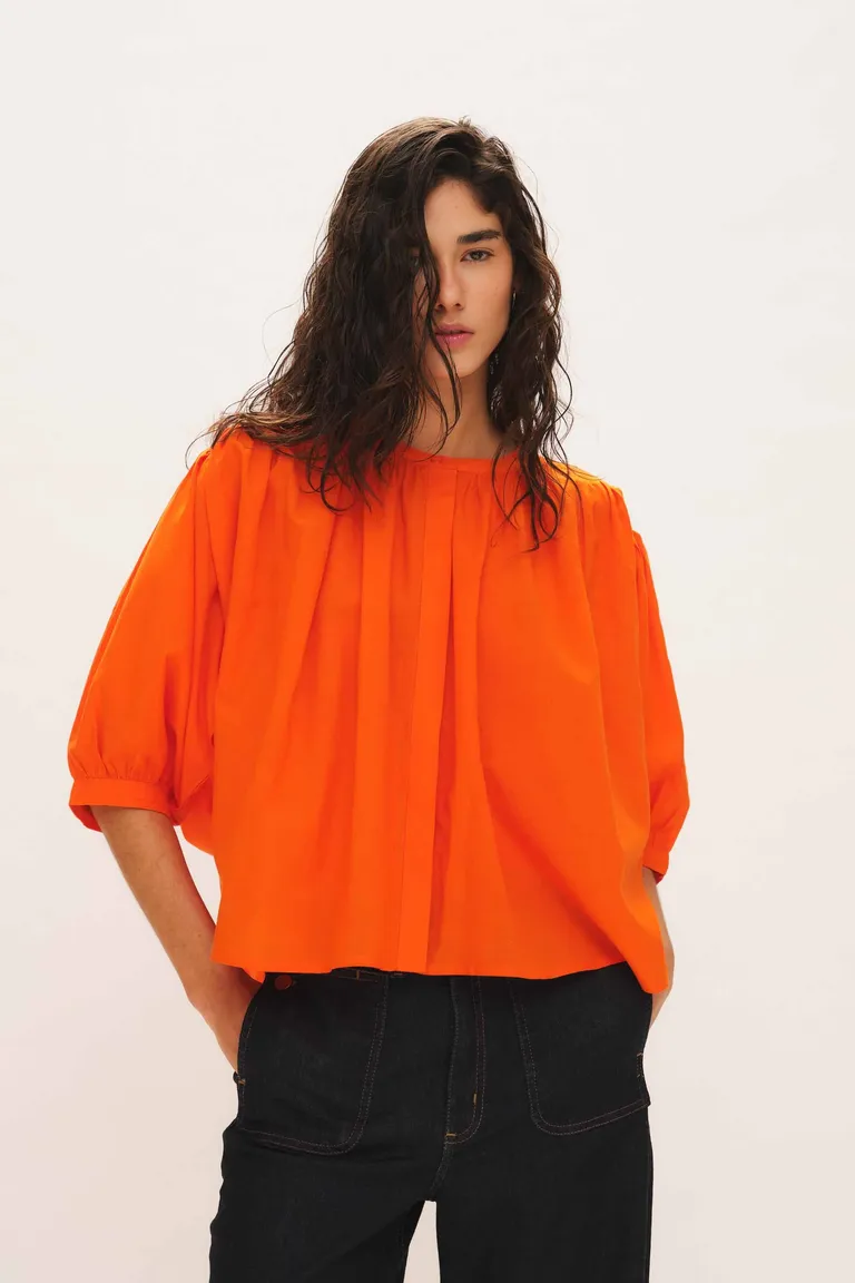 Blusa holgada de escote redondo con mangas tres cuartos y hombros caídos. Presenta una silueta amplia con sutiles pinzas en los hombros que aportan volumen y movimiento natural. Su diseño versátil de largo a la cadera permite combinarla en diversos looks casuales para el día a día.