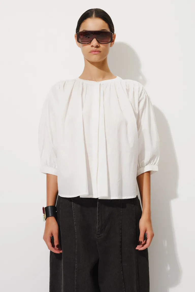 Camisa de escote redondo con cartera invisible y mangas con hombros caídos que aportan estructura. Su diseño presenta un calce equilibrado que llega hasta la primera cadera, ofreciendo versatilidad y comodidad para diversos conjuntos diarios.