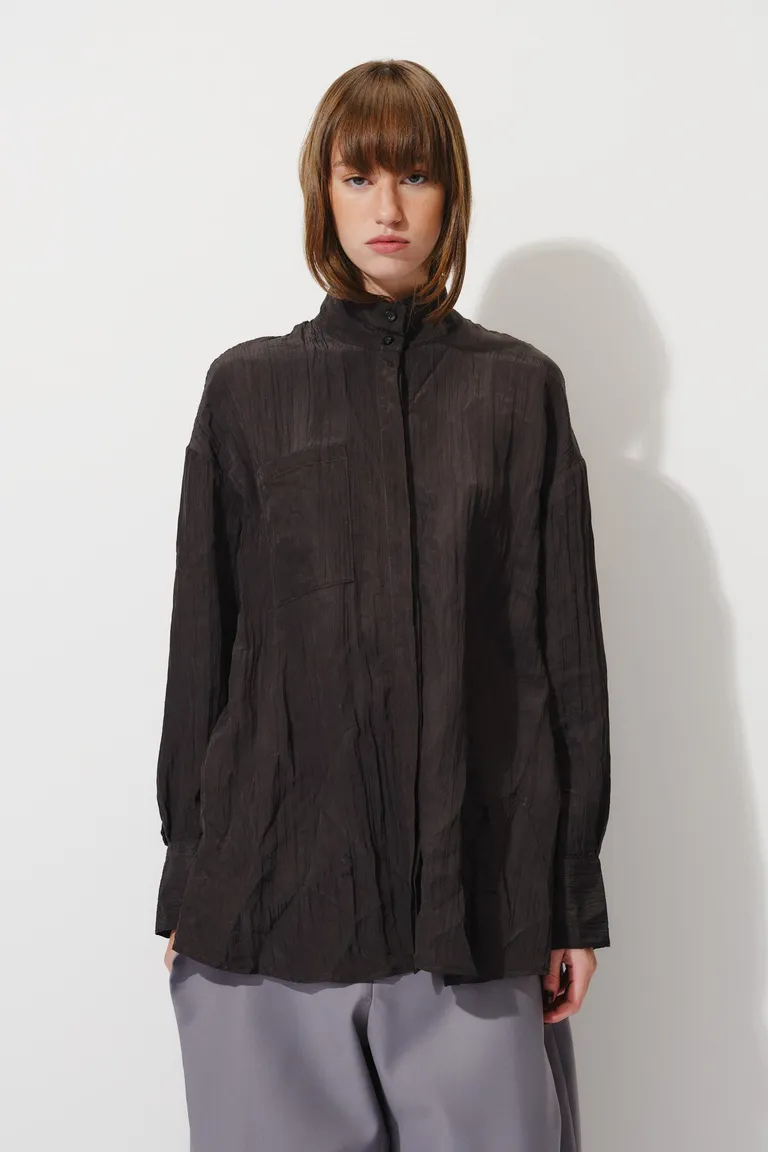 Camisa de diseño minimalista con cuello alto y cierre mediante doble abotonadura frontal. Presenta una silueta holgada y fluida con un sutil bolsillo aplicado en la parte delantera y cartera oculta para una terminación impecable. Una prenda versátil y sofisticada, diseñada con un estilo contemporáneo que se adapta a diversos outfits tanto para ocasiones formales como para uso cotidiano.