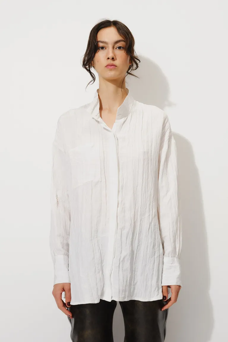 Camisa de manga larga con cuello alto y cierre frontal con cartera oculta. Diseño versátil de calce holgado con bolsillo delantero, ideal para combinar en looks casuales o formales. Un básico imprescindible para el guardarropa diario que aporta estructura y estilo.
