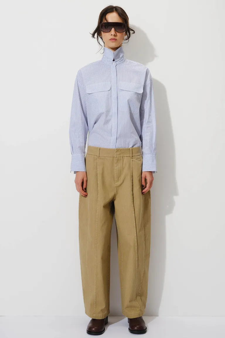 Camisa de calce oversize en poplín con diseño a rayas. Presenta cuello alto, botones ocultos bajo cartera frontal y dos bolsillos aplicados a la altura del pecho. Una prenda versátil ideal para integrar en outfits diarios con un estilo definido y contemporáneo.