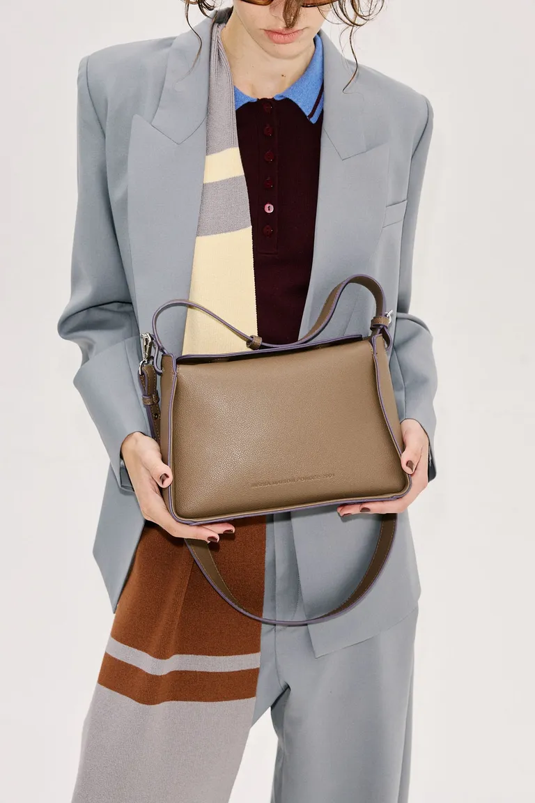 Cartera de tamaño mediano con diseño estructurado. Cuenta con doble opción de agarre, incluyendo manija corta y correa larga desmontable y regulable para llevar como bandolera. Su interior se encuentra forrado y dispone de bolsillos internos para organizar objetos personales, incluyendo uno con cierre de seguridad. Un accesorio versátil, funcional y de estilo contemporáneo, perfecto para el uso cotidiano gracias a su formato liviano y cómodo.