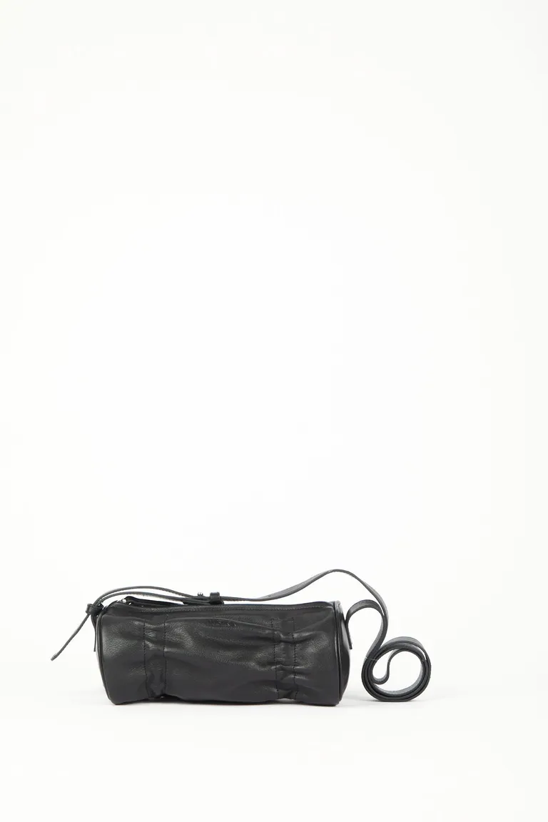 Cartera de formato cilíndrico con diseño minimalista, ideal para el uso diario. Presenta un detalle de fruncido en los laterales, cierre superior para mayor seguridad y una correa regulable que permite llevarla al hombro o cruzada. Un complemento compacto, práctico y versátil para completar cualquier look.