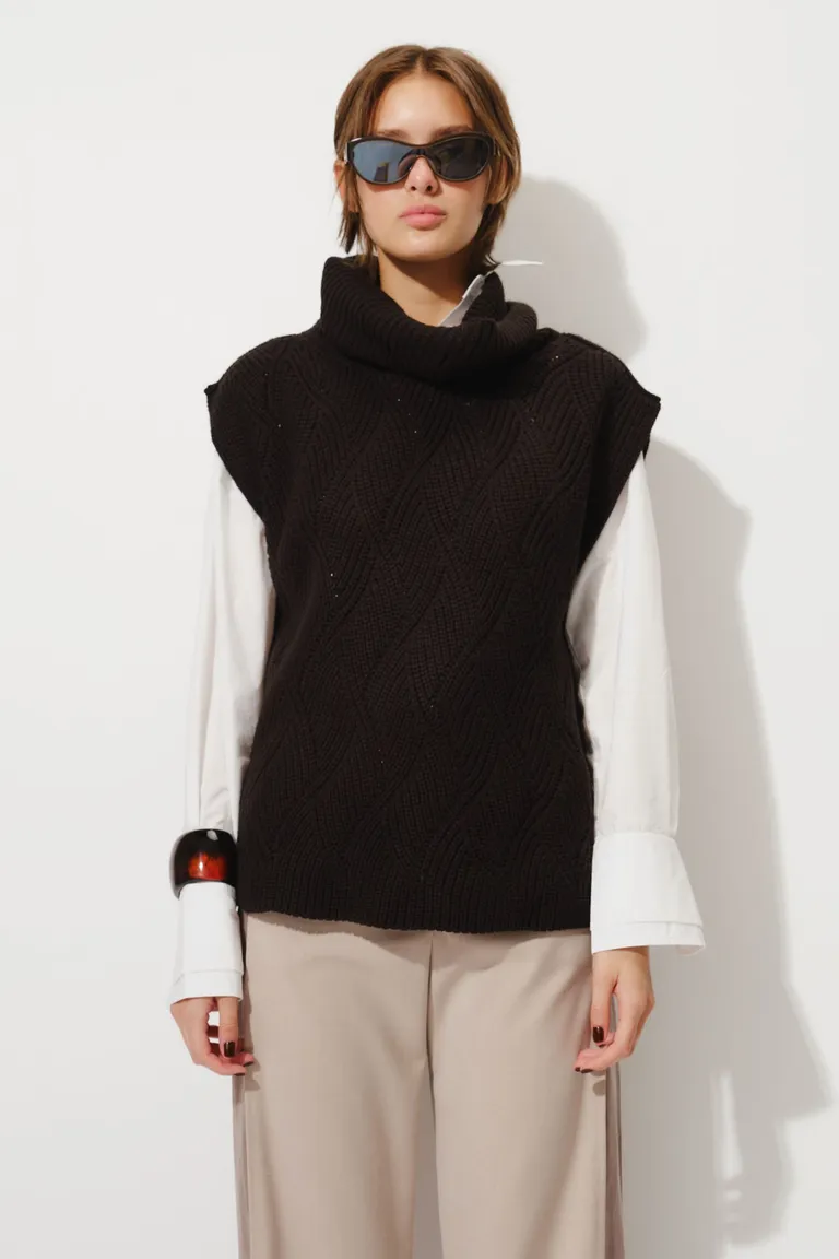 Chaleco tejido con cuello alto, diseñado sin mangas. Esta prenda presenta una textura tejida con detalle de tramado sutil. Su corte clásico y moderno lo convierte en una opción ideal para superponer sobre camisas o remeras en distintas ocasiones, aportando versatilidad y una capa de abrigo liviano al guardarropa diario.