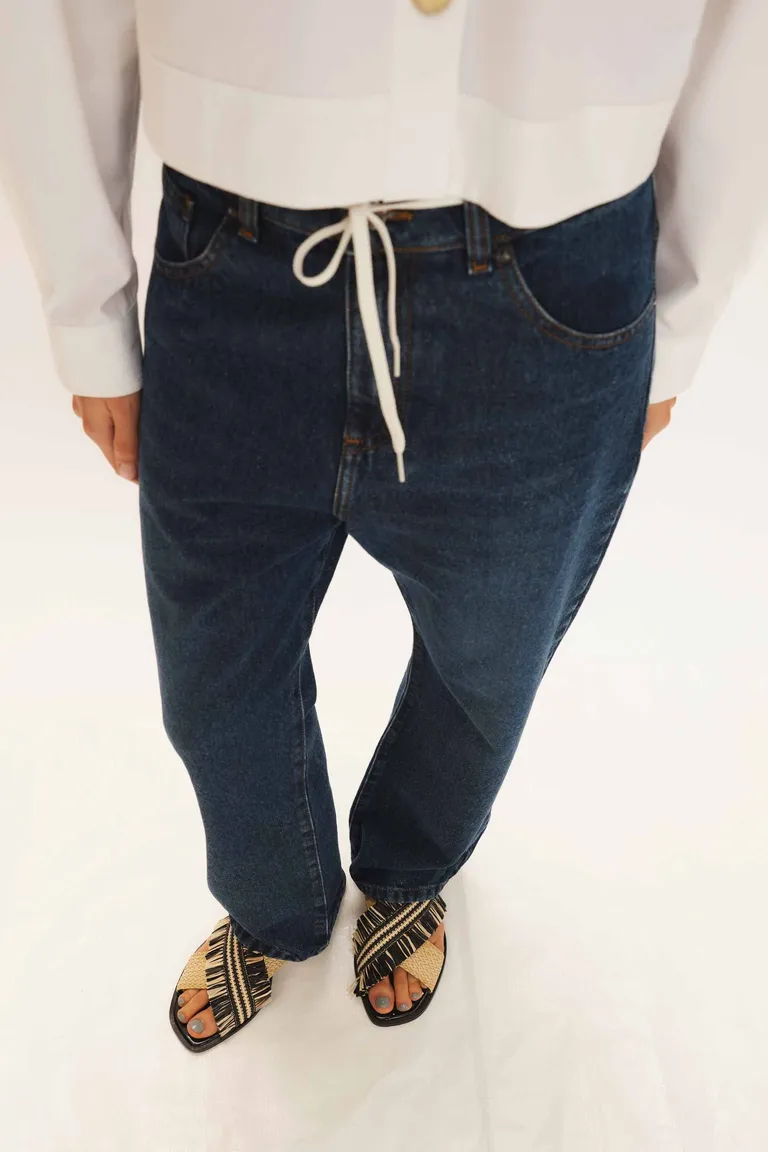Pantalón de estilo denim con ajuste en la cintura mediante cordón ajustable. Presenta un corte cómodo y versátil, ideal para completar outfits casuales de uso diario. Su diseño incorpora bolsillos laterales y una estructura clásica que se adapta a diversas ocasiones, brindando comodidad y estilo en un mismo modelo para integrar en tu guardarropa cotidiano.