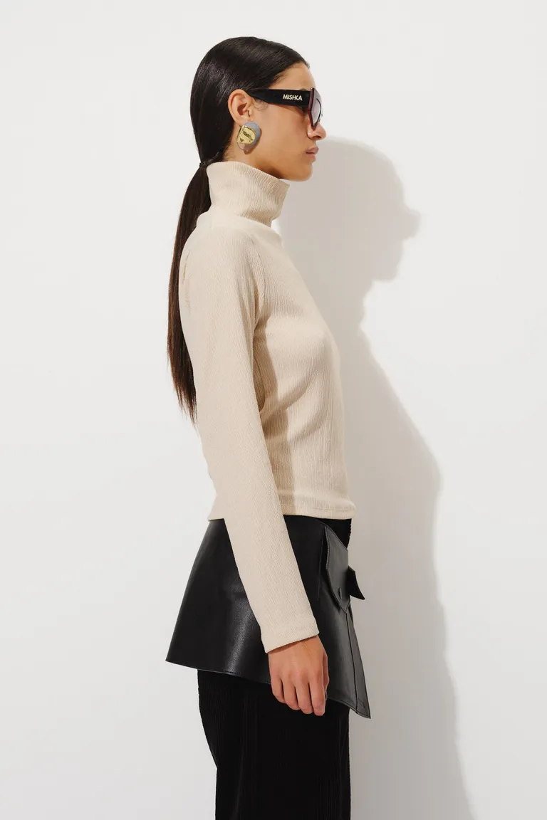 Remera de mangas largas y cuello alto con textura suave. Su diseño simple y elegante permite múltiples combinaciones para diferentes estilos. Es una prenda versátil, ideal para sumar al guardarropas básico y usar tanto de día como de noche.