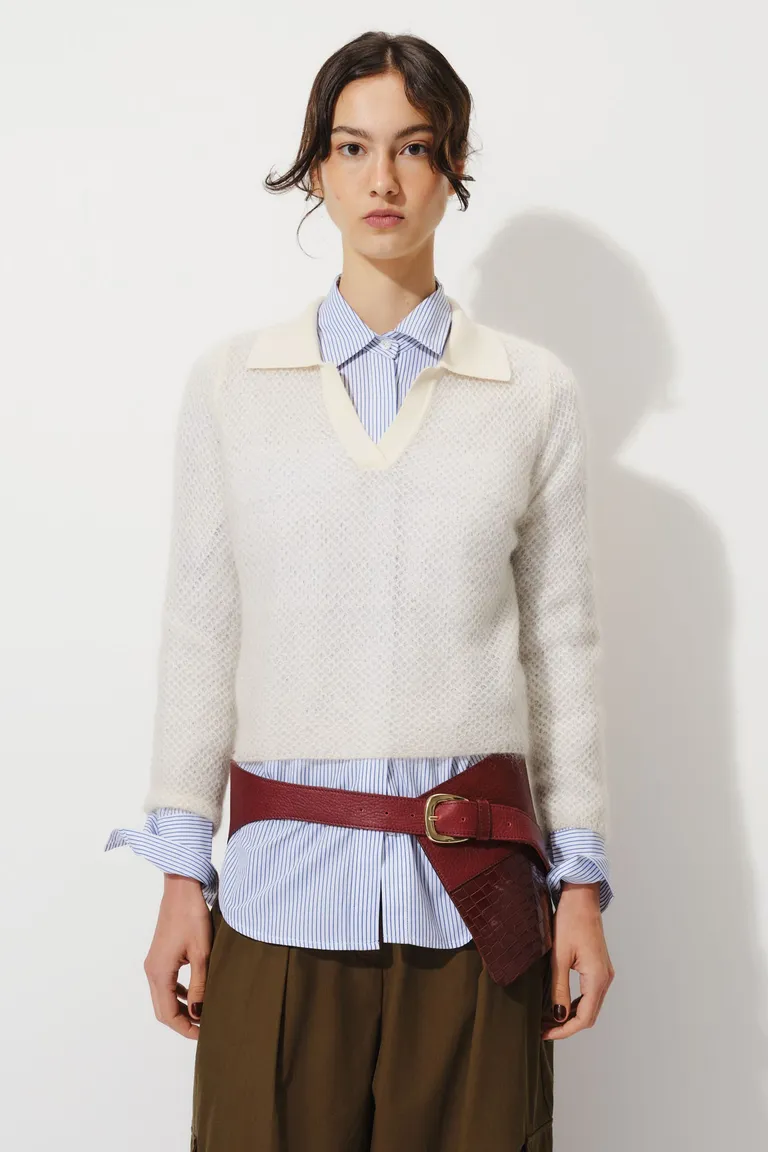 Sweater de manga larga con diseño de tejido entreabierto y silueta recta a la altura de la cintura. Presenta un escote en V con cuello tipo polo, ideal para completar looks urbanos y modernos. Una prenda versátil con terminaciones delicadas en puños y bajo, diseñada para ofrecer comodidad y estilo en cualquier ocasión del día.