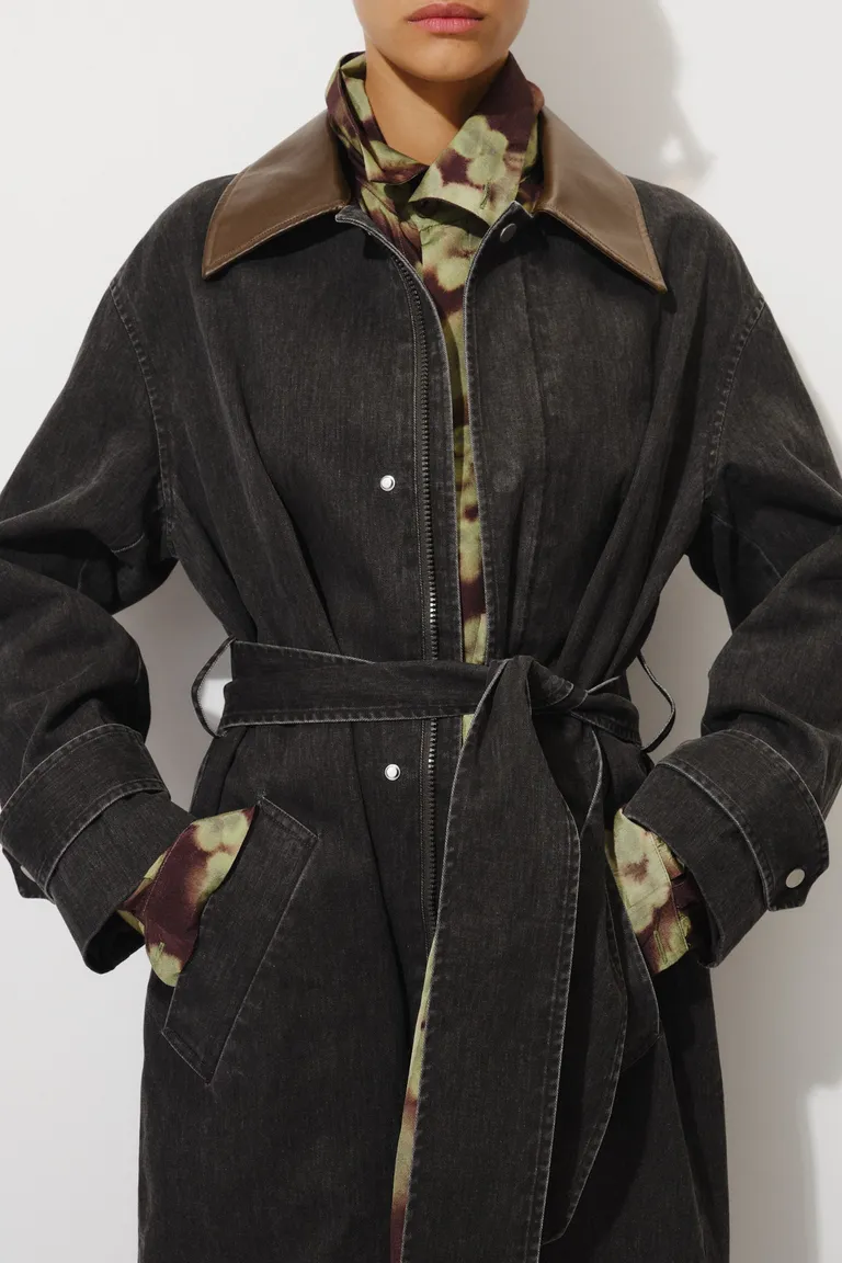 Tapado de silueta recta y largo por debajo de la rodilla. Su diseño clásico presenta cierre frontal, mangas largas con presillas ajustables y cinturón para definir la figura. El detalle distintivo es su cuello en contraste de textura, que aporta sofisticación a esta prenda versátil. Ideal para complementar cualquier conjunto urbano con un toque elegante y funcional durante las temporadas de transición.
