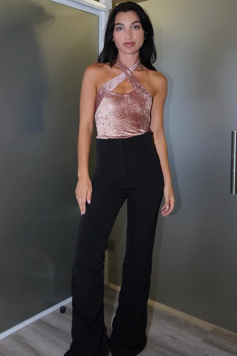 Pantalón de tiro alto con corte acampanado y diseño ajustado hasta la rodilla. Presenta una silueta clásica de vestir con cierre frontal, ideal para completar equipos formales o informales. Su diseño permite diversas combinaciones de estilo adaptándose a diferentes momentos del día con un calce cómodo y favorecedor.