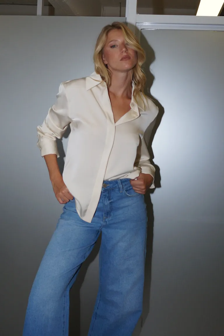 Pantalón de corte wide leg con diseño holgado y tiro medio. Presenta un lavado clásico con sutiles desgastes, cierre metálico y botón frontal, ideal para armar equipos urbanos y cómodos para el uso diario.