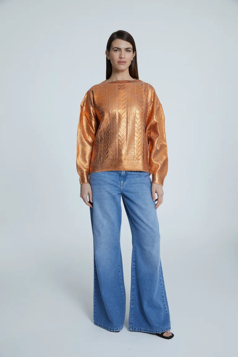 Sweater de tejido con diseño de trama fantasía y acabado metalizado. Presenta un corte con hombros caídos y cuello redondo, ofreciendo una silueta cómoda que llega a la altura de la segunda cadera. Los puños y el cuello cuentan con terminaciones en tejido acanalado para un calce preciso y estructurado. Una prenda versátil, ideal para sumar textura y brillo a tus outfits diarios, brindando un estilo distintivo en toda ocasión.