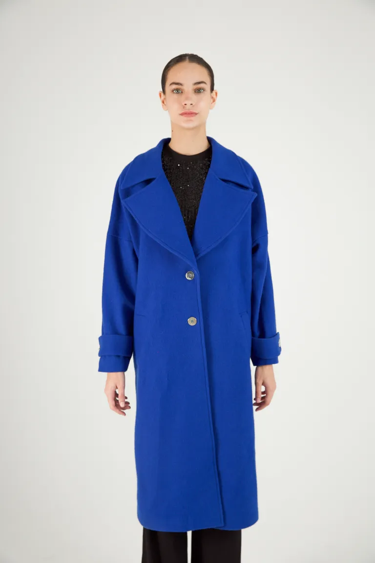 Tapado de corte largo 7/8 con diseño de hombros caídos y solapas anchas. Presenta un cierre frontal con dos botones y cuenta con forro interior completo. Una prenda versátil y estructurada para completar looks de temporada con un estilo clásico y elegante.
