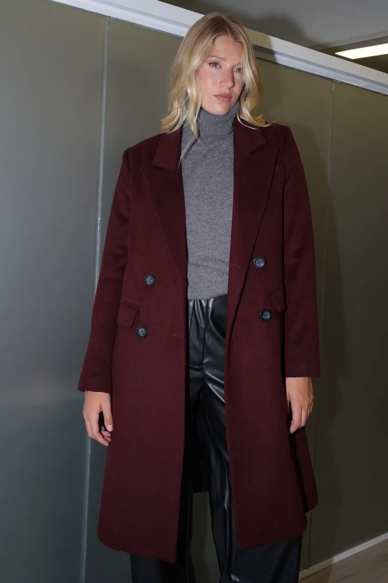 Tapado largo para mujer de estilo clásico con estructura de doble abotonadura. Presenta solapas tradicionales, mangas largas y bolsillos laterales con tapa. Ideal para completar looks formales o casuales durante la temporada de frío, ofreciendo una silueta elegante y versátil.