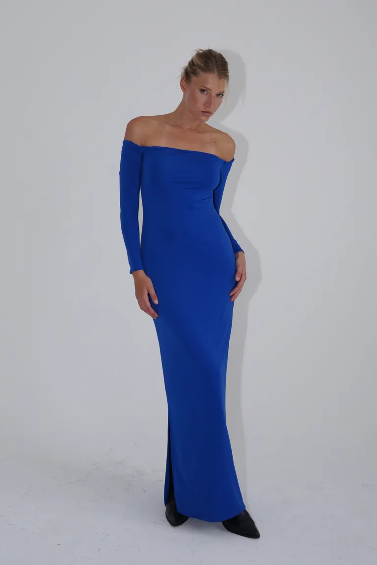 Vestido largo de diseño entallado con escote recto y hombros descubiertos. Presenta mangas largas, detalle de lazo con torsión en la espalda con escote profundo y tajo lateral. Una prenda versátil para diversas ocasiones que se adapta a la silueta femenina.