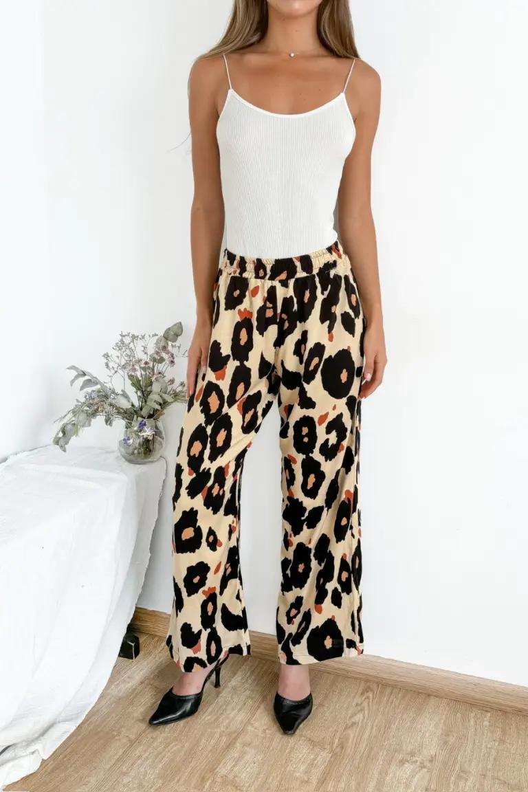 Pantalón palazzo de estampado animal print, confeccionado en una mezcla de lino y spandex que le brinda elasticidad y comodidad. Cuenta con cintura elástica y bolsillos laterales para un look casual y moderno. Ideal para combinar con diferentes prendas y lograr looks versátiles y stylish.