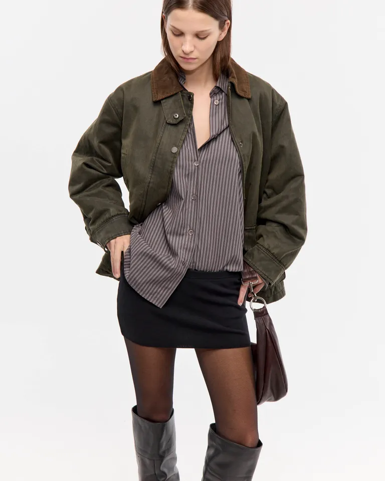 Elegante y versátil pollera corta en punto acanalado, confeccionada en viscosa. Tiro bajo y cintura elastizada para un ajuste cómodo y flattering. Perfecta para eventos formales o un look casual chic.
