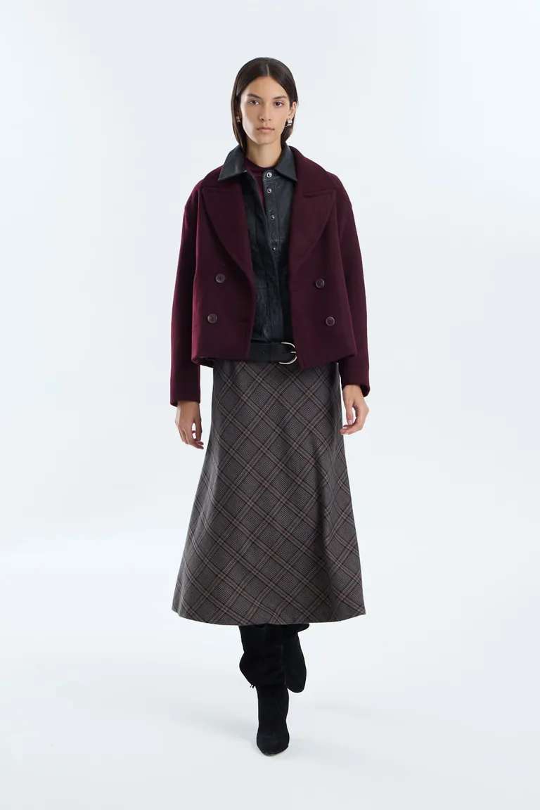 Abrigo corto de paño con cuello y solapa, presenta doble abotonadura frontal y un calce holgado. Es una prenda con diseño de largo modular a la primera cadera, ideal para completar equipos de temporada con estilo y versatilidad. Cuenta con bolsillos aplicados y un interior totalmente forrado para mayor confort en los días de bajas temperaturas.