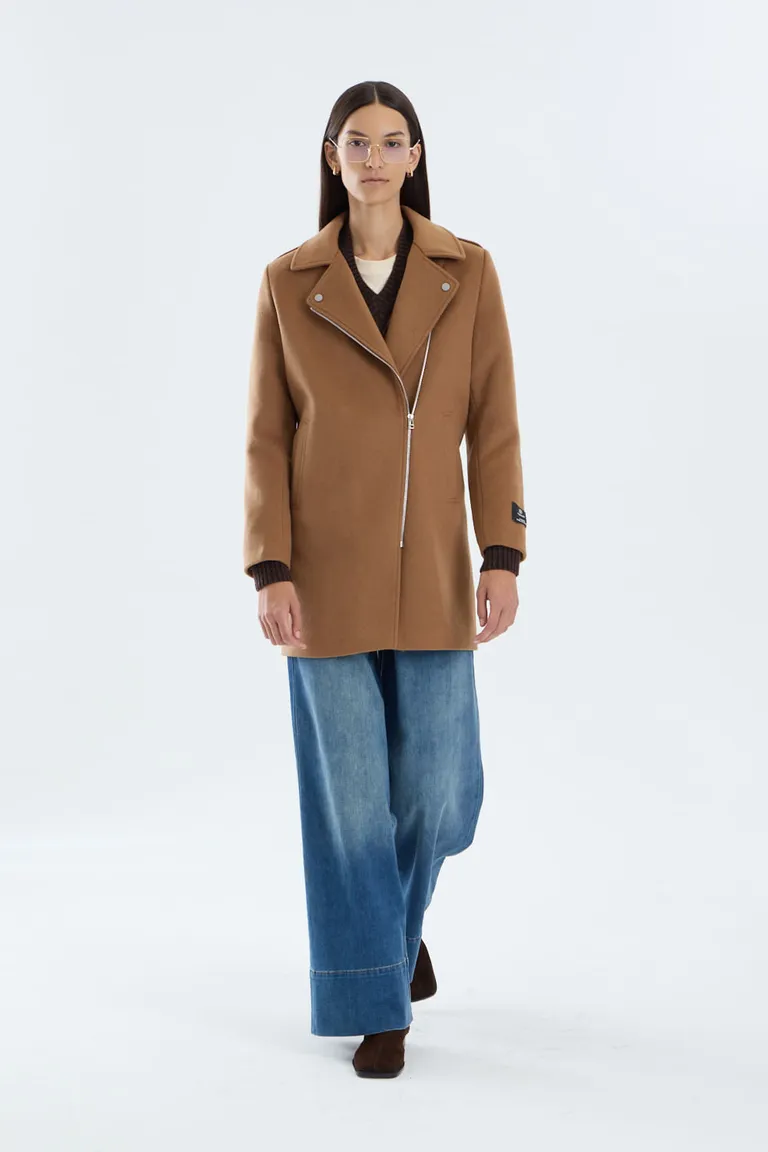 Abrigo de diseño tipo moto con cierre metálico frontal y en puños. Presenta bolsillos laterales funcionales y un tajo en la espalda que aporta movimiento. Es una prenda versátil, ideal para completar equipos urbanos y sofisticados durante los días de frío. Combina perfectamente con pantalones amplios o jeans, ofreciendo un ajuste entallado y un estilo moderno para el guardarropa femenino.